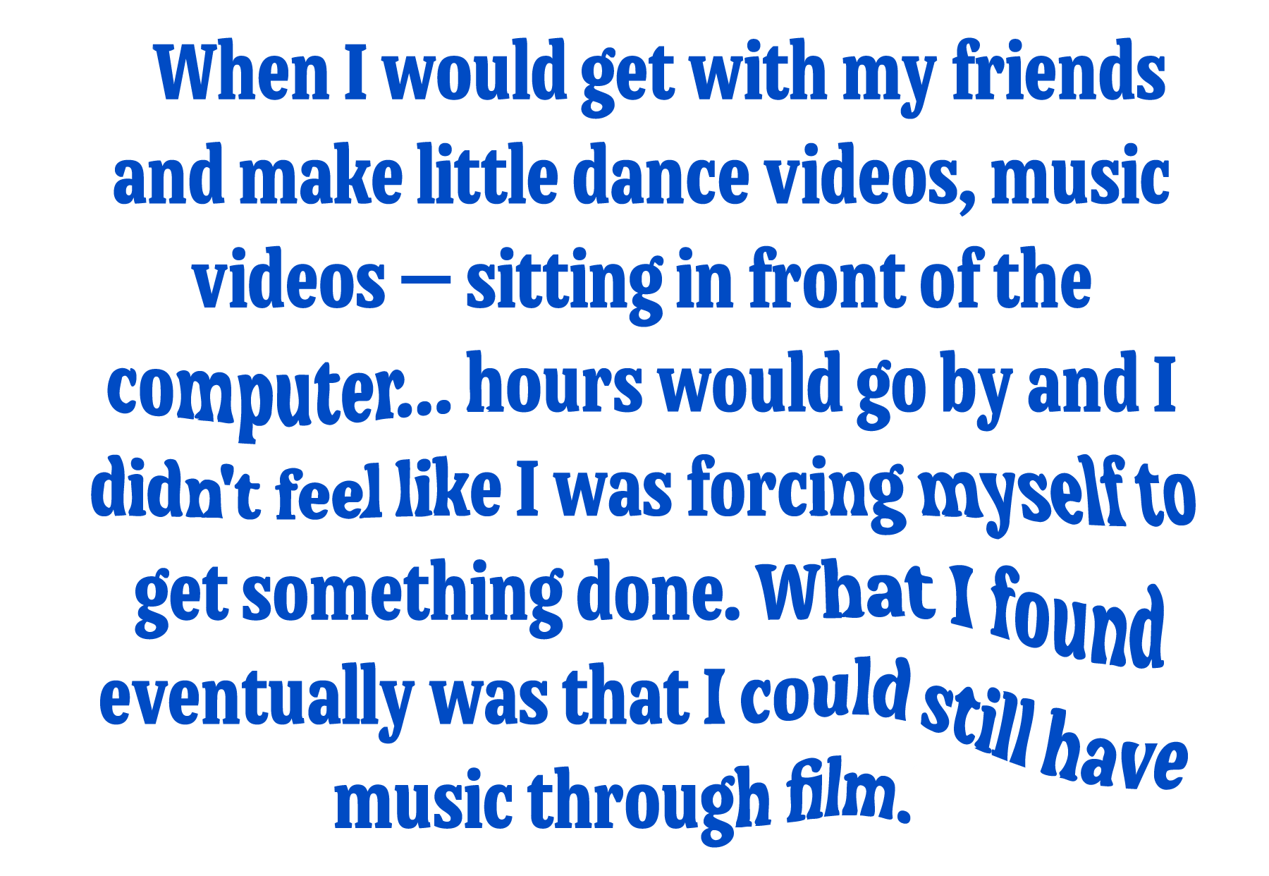 “When I would get with my friends and make little dance videos, music videos. [Later on] sitting in front of the computer, [I was] almost reliving that. Even though I was alone, I was still with my friends. Hours were going by, and I didn't feel like I was forcing myself to get something done.”