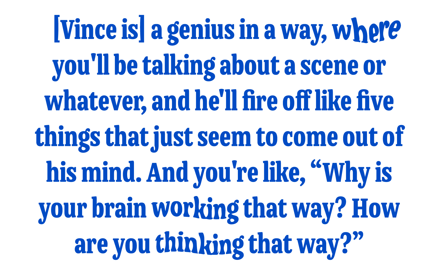 Honestly, not too far off. I mean, obviously, it's exaggerated, but a lot of the conceptual ideas or even the witty responses and things that might not even be coming from his character in particular, like what some other person might say in response to Vince's character, is something that he thought of. He’s a genius in a way, where you'll be talking about a scene or whatever, and he'll fire off like five things that just seem to come out of his mind. And you're like, “Why is your brain working that way? How are you thinking that way?” That's not a character. I think it’s genuinely a pretty close version to himself.
