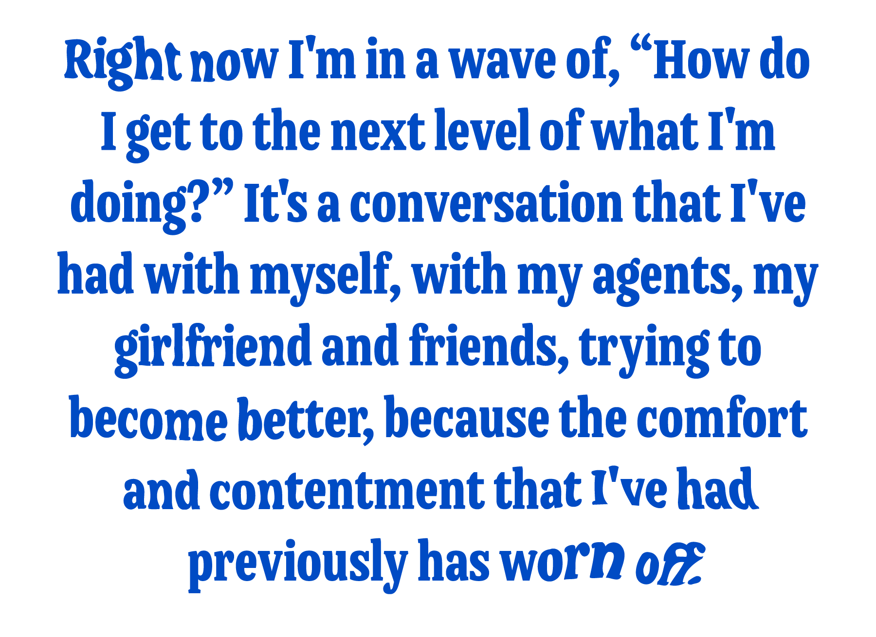 Right now I'm in a wave of, “How do I get to the next level of what I'm doing?” It's a conversation that I've had with myself, with my agents, my girlfriend, and my friends. [I’m] trying to become better, because the comfort and contentment that I've had previously has worn off. And eventually, once I get to that next level, I’ll hit another point of like, “Ah, this is great! Look at this. This other set of worlds and creative and traveling is happening. I have money in my account that I haven't had before. I've had experiences that I've never had before. This is great! Why would I ask for more?” Eventually, that sort of wears off for me, and I go, “OK, either all this the rest of my life, or I gotta figure out how to become better.” I don't want to become worse, you know?